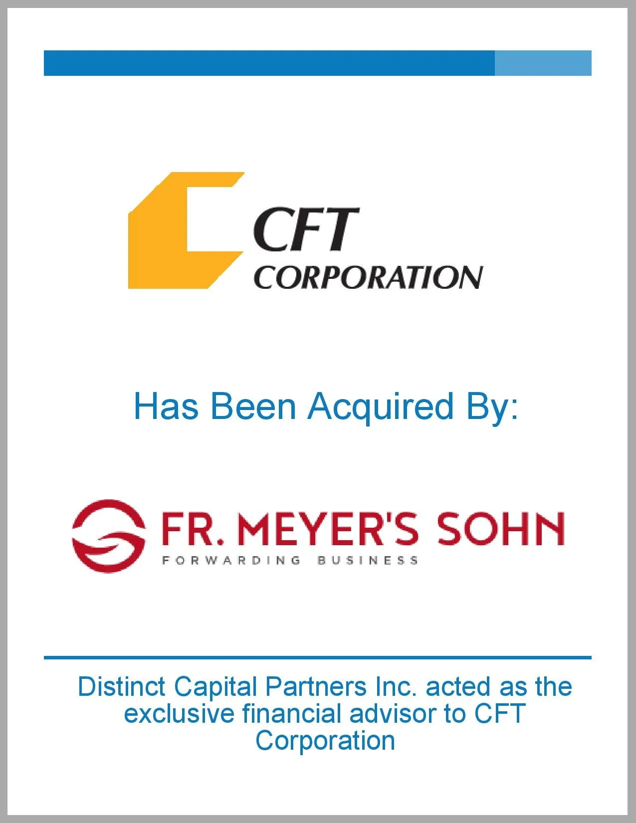 Oakville, ON, February 2026. Distinct Capital Partners Inc. is pleased to announce the successful acquisition of logistics specialist, CFT Corporation (CFT) by Fr. Meyer’s Sohn (FMS) a Hamburg, Germany based global logistics company.